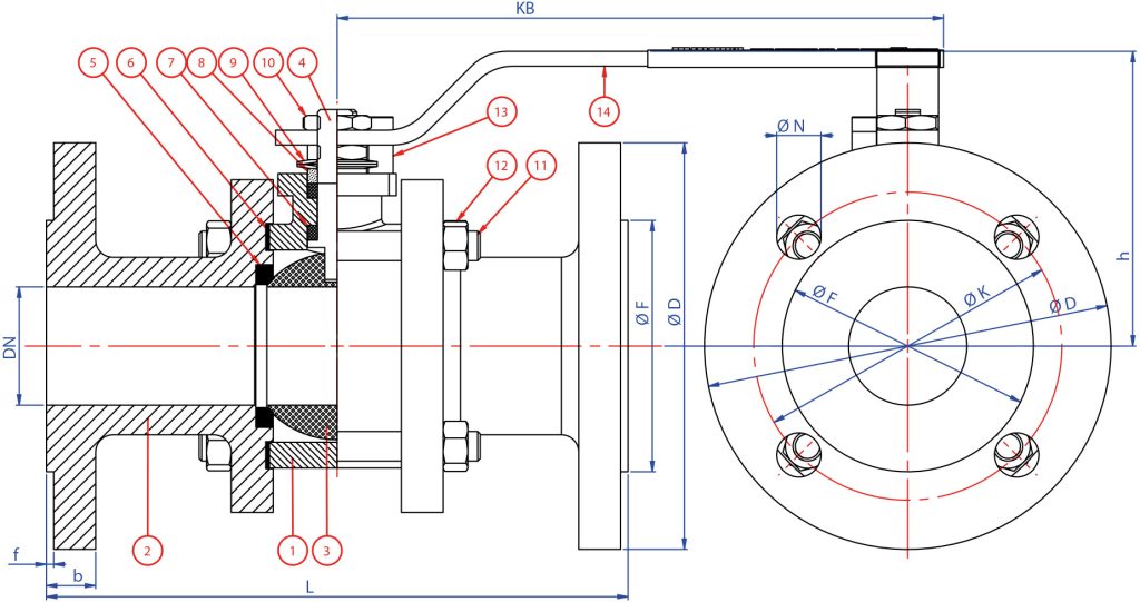 | DN (Inch) | L | KB | h | f | D | K | F |
